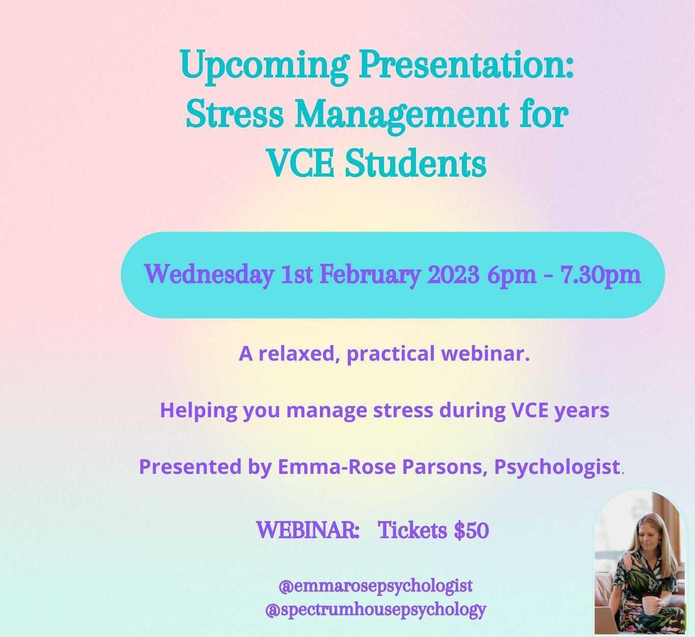 past webinarsWebinar: Stress Management for VCE StudentsJanuary 9, 2023Spectrum House Stress Management for VCE Students (Webinar) Registrations for this event are now closed. A fast paced practical webinar. Helping you manage stress during VCE years. Wednesday, 1st of February, 2023 @ 6:00-7.30pm. Registrations are closed.
