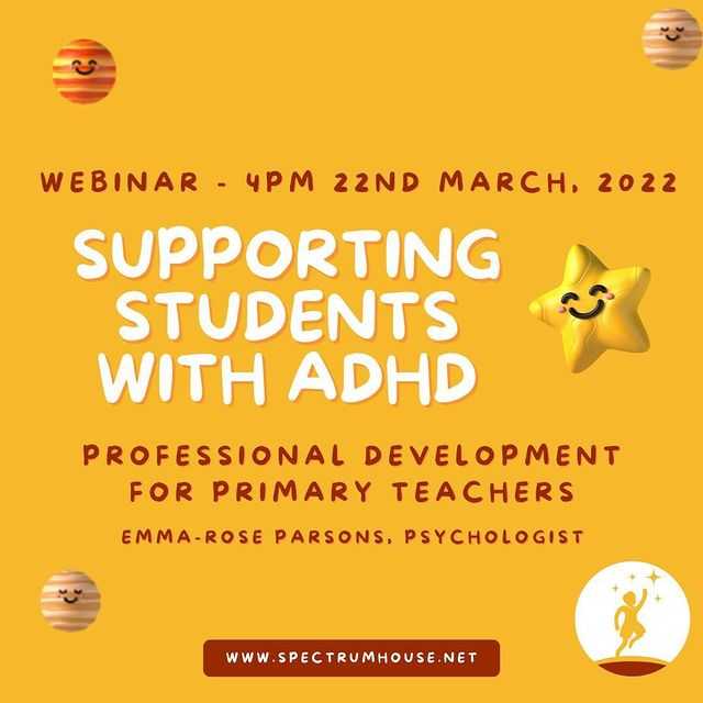 past webinarsWebinar: Supporting Students with ADHDNovember 14, 2021Spectrum House Supporting Anxious Students Registrations for this event are now closed. Emma-Rose is running a professional development webinar for primary teachers on supporting students with ADHD. Wednesday, 22nd of March, 2022 @ 4pm. Registrations are closed.
